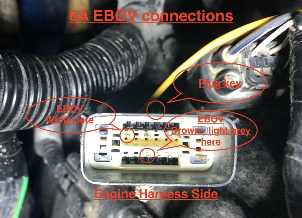 • A - First the EBOV. The EBOV is 2 wires (one white and one brown – light grey), the sensor is on the intercooler. These 2 wires can be run up to a plug behind the battery, somewhat below the ECM connection. This plug goes from your new engine harness back to a body harness. This connector is 16 pins, 12 smaller pins, and 4 larger ones in the corners (not all pins are used). Connect the EBOV white wire into the grey wire on the engine harness, it is a small wire corner pin. Connect the EBOV brown-grey wire into the yellow green engine harness wire, it is the other row and 2 spots over from the last connection. View attachment 164464