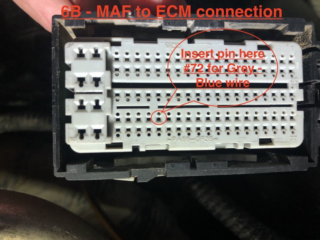 • B - Second is the new MAF sensor which has 4 wires: yellow-brown, green-brown, yellow-green, and grey-blue. You will need to solder and run 3 wires over to the other side of the engine compartment. Two of which stop at a 16 pin plug behind the battery, a little before the other connector you ran the EBOV wires to. The yellow-brown and the yellow green wires from the MAF get run to the yellow-brown and yellow-green wires on that 16 pin plug (same color to same color). The third wire is the grey-blue. It will need to continue on and get plugged into one of two large connectors going into the ECM. However this is tricky because there is no pin on the connector to splice into. You will need to disassemble the connector and insert a plug into spot #72. This is doable and there are several videos on Youtube on the subject. I broke several pins before I managed to remove and replace one without damaging it. It is the 5th pin from the left on the 4th row down from the top when holding the connector looking into the plug with the 8 large raised pins on the left side. Finally the 4th green-brown wire simply gets connected into the existing purple wire that was going to the original MAF. This wire ends up at pin 75, 3 spots over from the pin you installed on the ECM plug if you are curious. View attachment 164465